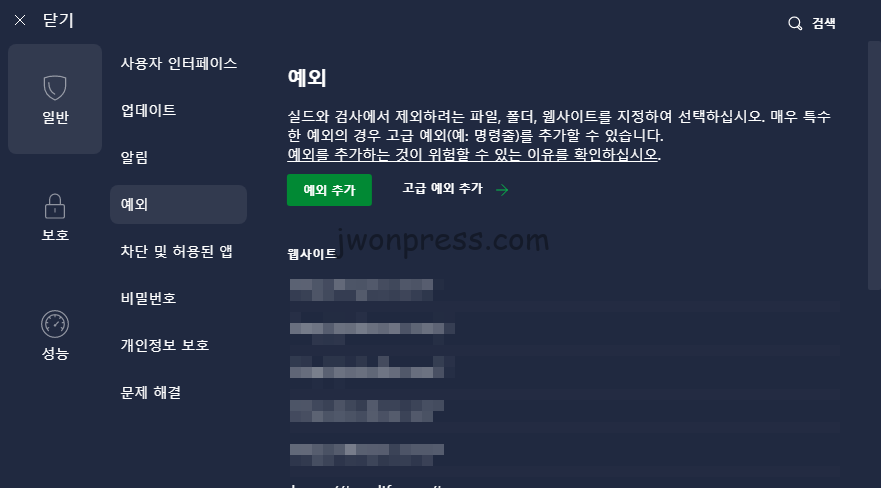 - 예외 설정: 접속이 성공적일 경우, 해당 사이트를 백신이나 보안 프로그램의 예외 목록에 추가하세요. 이 예외 설정은 보안 프로그램마다 다를 수 있으나, 대부분의 프로그램은 설정 메뉴 내에서 예외를 추가할 수 있는 옵션을 제공합니다.