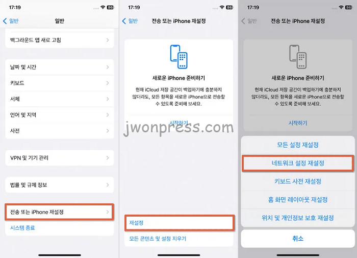 - 아이폰: 설정 > 일반 > 전송 또는 (기기) 재설정 > 재설정 > 네트워크 설정 재설정