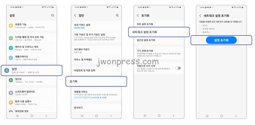 핸드폰의 경우 아래와 같이 네트워크 재설정을 하실 수 있습니다.
